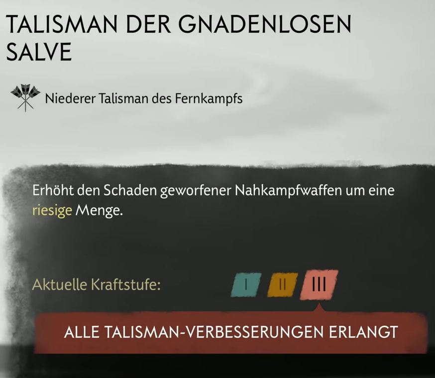 Dieser Talisman erhöht den Schaden geworfener Nahkampfwaffen stark.