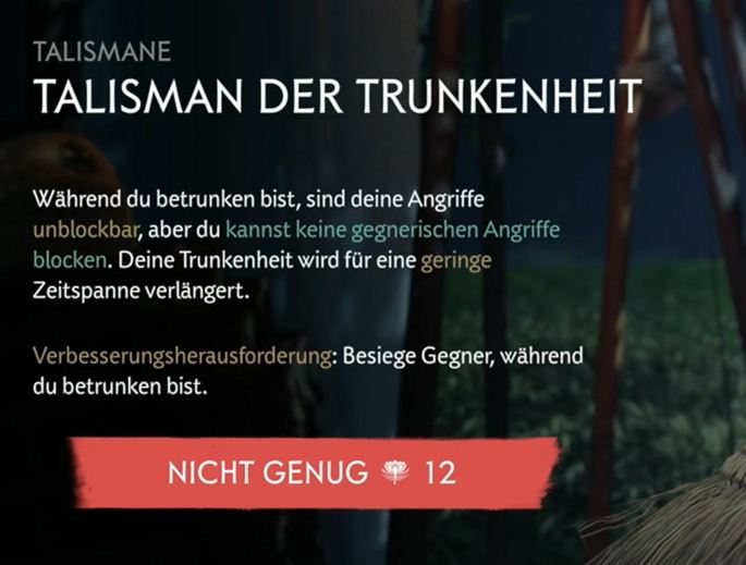 • Talisman der Trunkenheit: Wenn du betrunken bist (ja, richtig gelesen), werden deine Angriffe unblockbar, aber du kannst auch nicht mehr blocken. Risiko und Belohnung perfekt ausbalanciert.